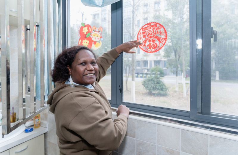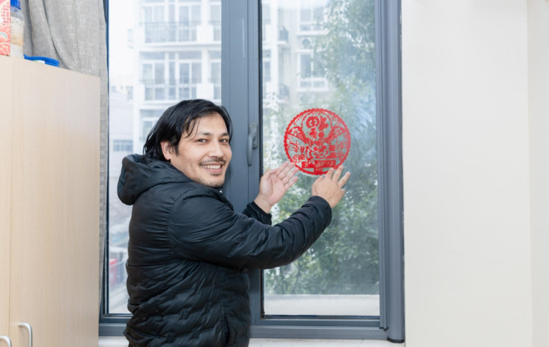 随后校领导来到巴基斯坦学员邵波的房间,与留学生一起贴春联、贴窗花,并介绍对联上文字的吉祥含义,房间的喜庆氛围一下子显现了出来。