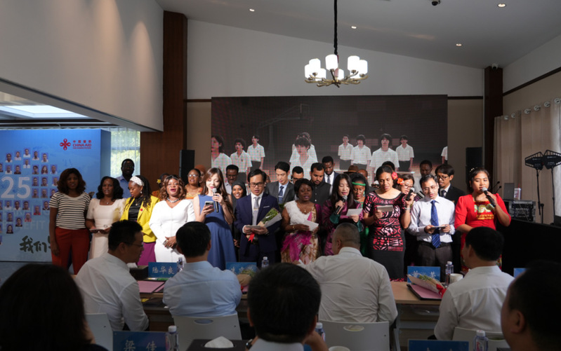 李乾文为校友联络员颁发证书,来自亚洲、非洲和大洋洲的三位同学将肩负起联络母校与全球校友的重任。