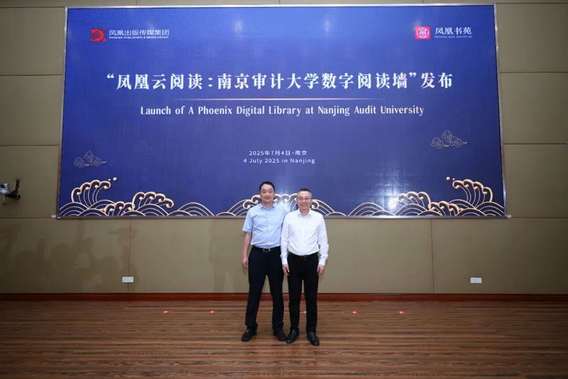 凤凰出版传媒集团副总经理单翔与任志成副校长共同启动南京审计大学与凤凰出版传媒集团共建“云上阅读墙”仪式。