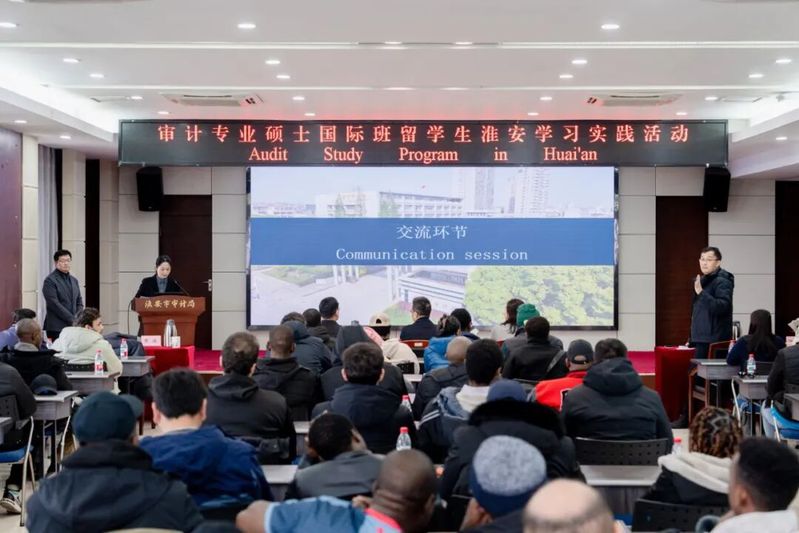 留学生在学习实践的第二天走进淮安市审计局,与中国的审计同行围绕审计实务开展深入交流,互学互鉴。